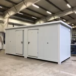 Contenedor sanitario – modular, colocado sobre una estructura de acero (elevada) dentro de la nave de producción.