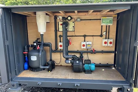 Una vez que la piscina esté en su lugar, deberá llenarse de agua y un electricista deberá conectarla al panel de fusibles del contenedor. Dependiendo de las opciones, se necesitará una fuente de alimentación capaz de 13 kW.
